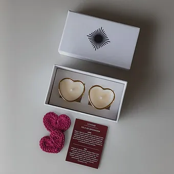 Cada vela rende muito e vem acompanhada de um card explicativo com o modo de uso e os detalhes de cada essência. Como mimo especial, o kit inclui dois porta-velas em formato de coração feitos à mão, que adicionam ainda mais afeto à experiência.